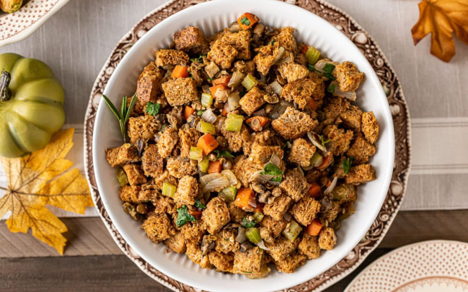 A slightly sweet, buttery take on stuffing made with cornbread crumbs and real herbs, offering a unique twist on the classic savory mix.