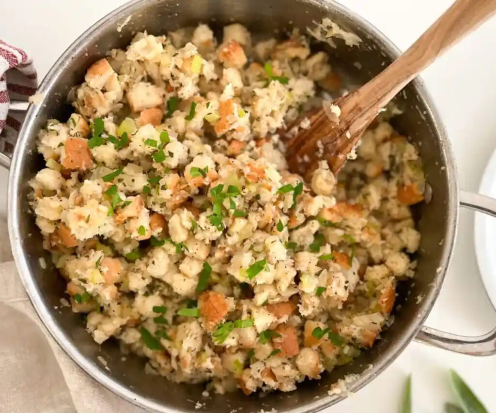 A slightly sweet, buttery take on stuffing made with cornbread crumbs and real herbs, offering a unique twist on the classic savory mix.